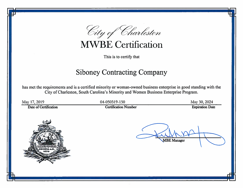 Siboney Contracting Co. is a certified Minority Business Enterprise (MBE)