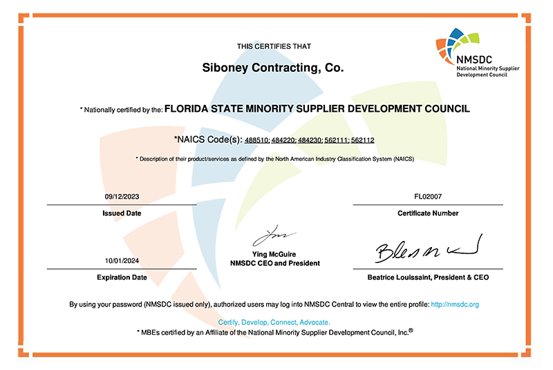 This prestigious certification, recognizes Siboney Contracting Co. as a trusted minority-owned business. MBE Certification focuses on supplier diversity and provides access to a large network of corporate members looking to facilitate MBE integration into their organization. Siboney Contracting Co. is certified by the National Minority Supplier Development Council (NMSDC) in addition to several states and municipalities in our nationwide operating footprint.